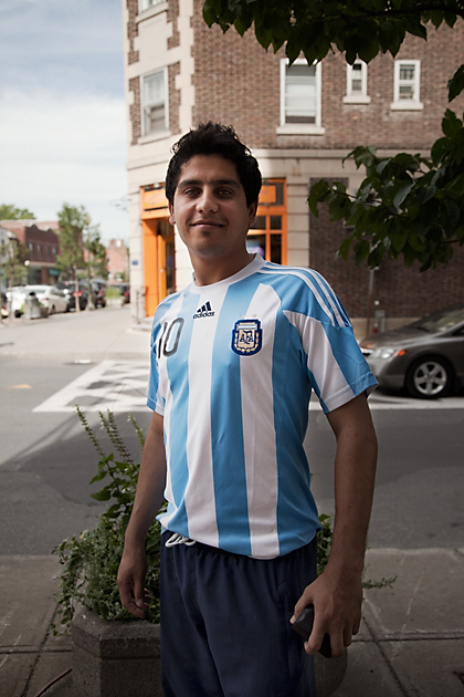 I was turning around a street corner occupied by a bank (it almost always is) when through the dark glass, inside, I saw an Argentinian shirt at the ATM machine. As I was waiting I thought how all the national team shirts I met so far are South American. But out came Yasir in his No. 10 Messi jersey. Yasir is from Pakistan and was presented with the Argentinian shirt from a friend who is from Morocco, talking to, and photographed by, a Bosnian guy, here in Canada. Canadian immigration officials shouldn’t be taking all the credit for this meeting of five continents since large responsibility lies in what’s known as Messi magic.