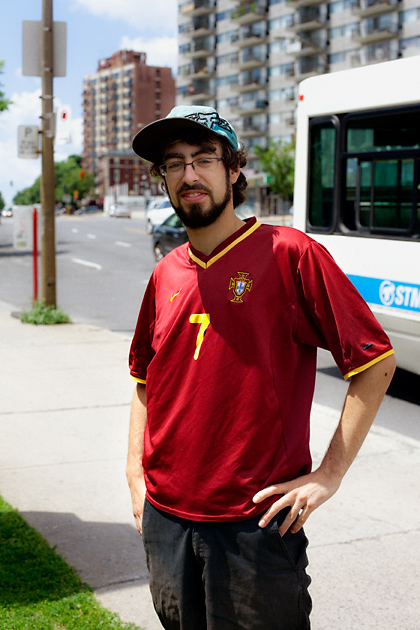 I noticed Patrick driving by and then stopping at the local gas station. I walked back and approached him. Patrick doesn’t follow soccer much. He is simply too busy, he says; artist, musician, rapper, all around party organizer. A few years back he visited Boom Festival in Idanha-a-Nova and had a fantastic time, fell in love with the place. He doesn’t remember when he got his jersey but since he has a few friends in Montreal who are Portuguese, they must played part in the decision. Patrick was born in Gatineau, Quebec and that makes him one of the very few born Quebecers I encountered wearing soccer shirts. But with Montreal Impact in MLS now, the numbers are growing.
